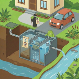乗用車1台分の敷地に収まる浄化槽 小さな敷地に、静